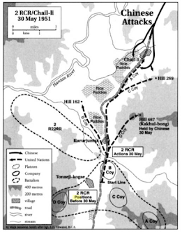 On May 30, 1951, Canadian forces moved into the town of Chail-li, and were quickly attacked by Chinese forces. Due to the large Chinese attack on Chail-li, the Canadians were forced to retreat.